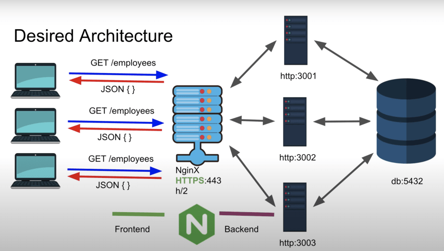 这个图不难理解,它是目前为止所有概念的一个组合。在这里,我们有 3 个后端服务器运行在 3001、3002 和 3003 端口,这些后端服务器都能访问同一个运行在 5432 端口的数据库。