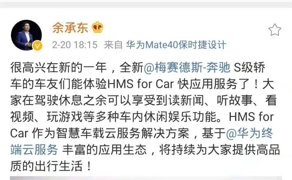 近日,华为消费者业务 CEO 余承东官宣了一条好消息,那就是华为鸿蒙 OS 系统生态 HMS For Car 即将登入梅赛德斯奔驰 S 级豪华轿车。