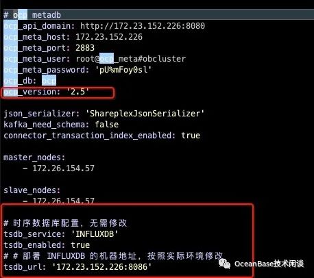 这个参数文件里有 ocp 的配置信息(不需要修改)。安装会自动在 ocp 元数据库集群里创建一个租户(先确保 ocp 元数据库集群里的资源足够: 2c5g)