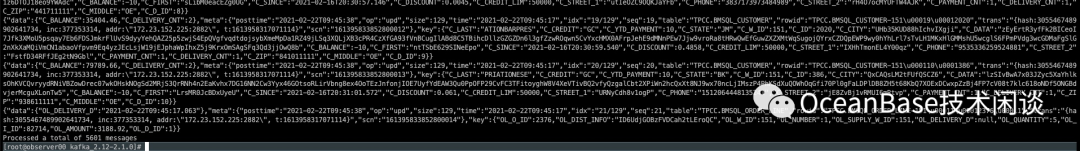 [root@observer00 ~]# cd kafka_2.12-2.1.0[root@observer00 kafka_2.12-2.1.0]# bin/kafka-console-consumer.sh --bootstrap-server 172.23.152.226:9092 --topic tpcc_topic --from-beginning