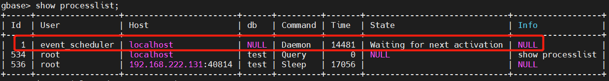 gbase> show variables like '%event_scheduler%'; -- 查看调度器状态