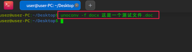 1.鼠标右击桌面空白处,选择“在终端中打开”,输入命令:unoconv -f docx 这是一个测试文件.doc(需转换文件名),按回车键。