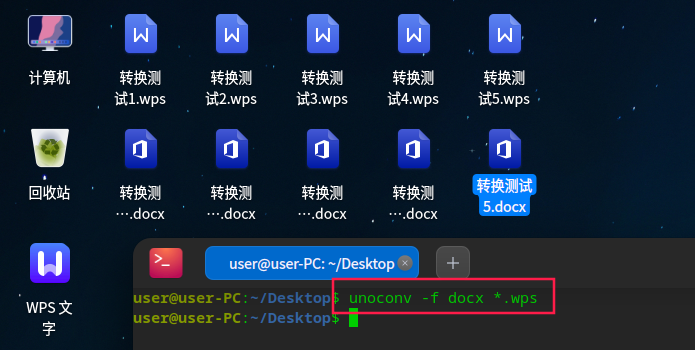 2.鼠标右击桌面空白处,选择“在终端中打开”,输入命令:unoconv -f 目标格式 *.当前格式,即unoconv -f docx *.wps,按回车键。