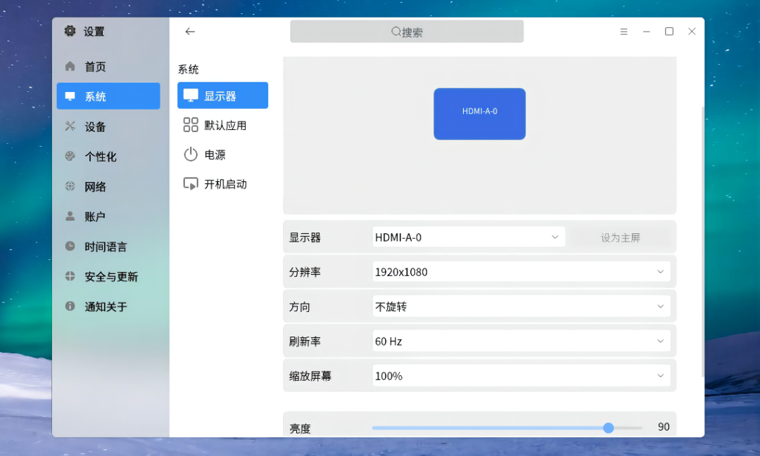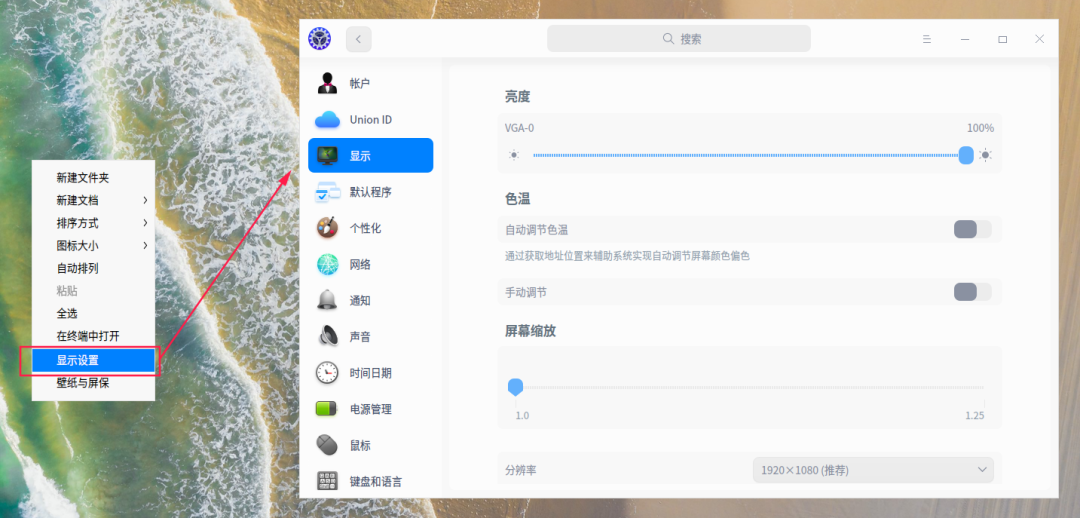 鼠标右击桌面空白处,选择“显示设置”。依次设置分辨率、亮度、色温、刷新率。
