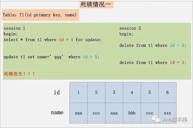 一般的情况,两个session分别通过一个sql持有一把锁,然后互相访问对方加锁的数据产生死锁。