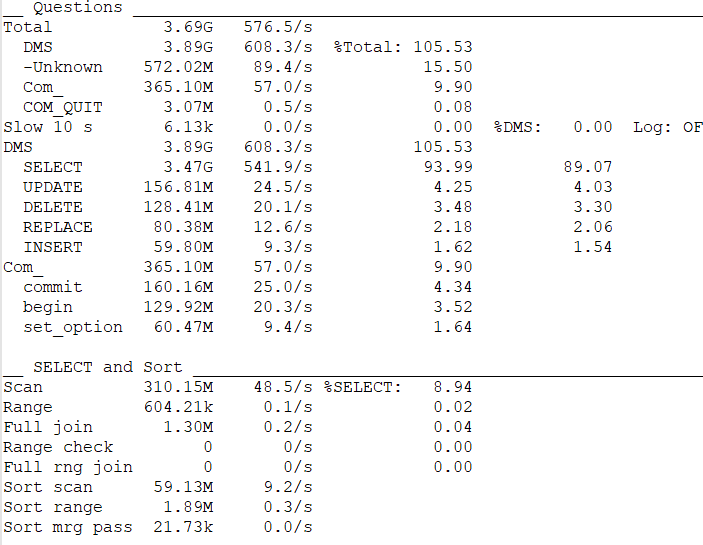 DMS部分告诉我们这个数据库中各种 SQL 所占的比例,这个例子中,SELECT多,要做 SQL 优化的话,肯定优先考虑SELECT语句,才会起到立竿见影的效果。