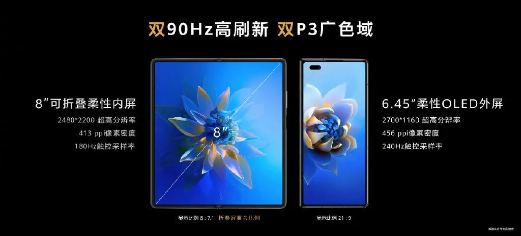 不可否认,华为 Mate X2 的设计非常惊艳!8:7.1 黄金比例柔性内屏,上覆截止目前业界首发磁控纳米光学膜,有效降低屏幕反光率。6.45 英寸外屏,内外屏双高刷新率与 P3 广色域。