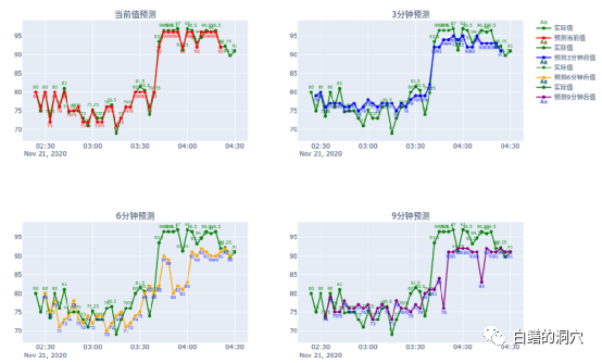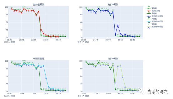 大家看上面这个例子,在一次数据库实例HANG 住,数据库无法提供任何服务,3分钟预测模型十分准确的提前3分钟发现了这个健康状态的突降。而6分钟预测与9分钟预测都出现了延迟。如果这是在生产环境上,运维人员将在数据库HANG 死前3分钟得到风险的预警,有可能在问题恶化前完成问题的处置。