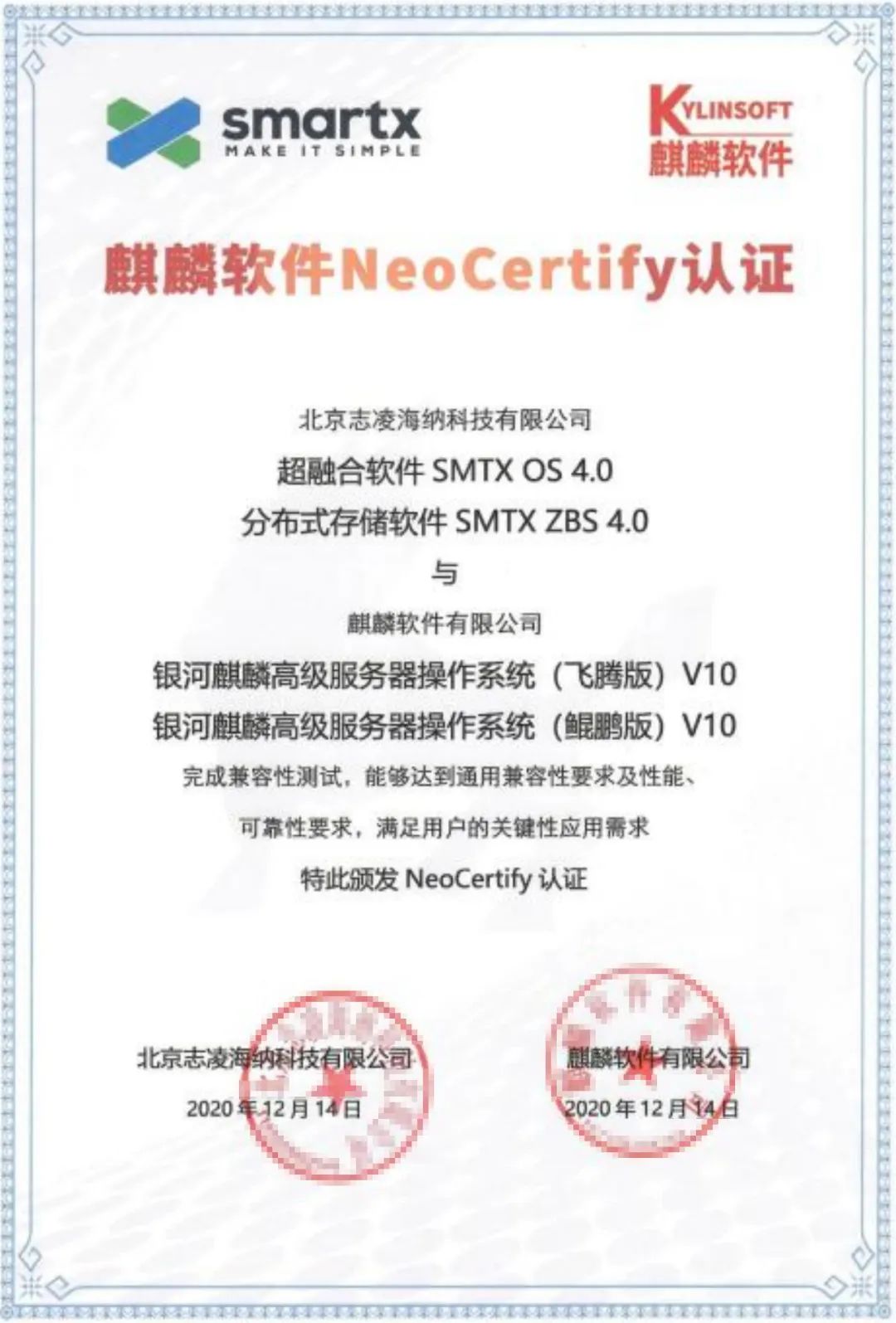 此前,志凌海纳 SmartX 超融软件 SMTX OS 4.0 与分布式存储软件 SMTX ZBS 4.0 就与银河麒麟高级服务器操作系统V10飞腾版、鲲鹏版完成适配认证,并在多个金融机构生产环境中部署,在兼容适配的基础上,双方融合自身技术储备,开展并完成了HostOS 开发产品的定制,旨在为客户提供高稳定性、高可用性的安全环境。
