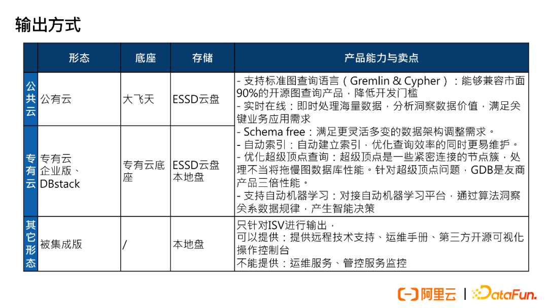 GDB包括公共云、专有云(银行、科研机构)以及可被集成版本(评测场景)等多种形态。下表为各个形态的底座、存储和产品能力及卖点的介绍。