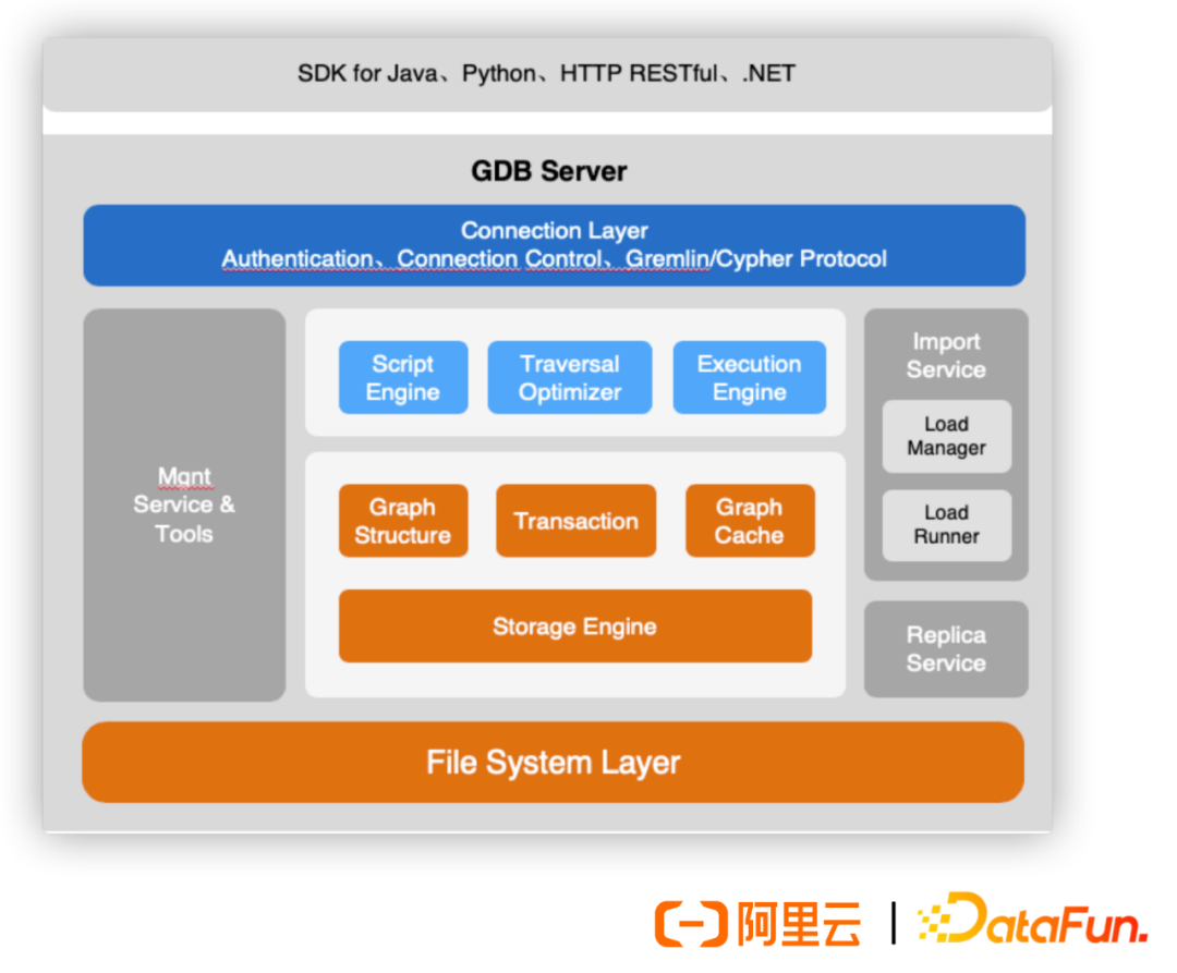 在接入层,兼容Gremlin和Cypher两大业界主流语法,同时涵盖多语言sdk 以及权限管理,鉴权管理和账号管理。