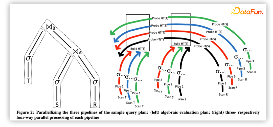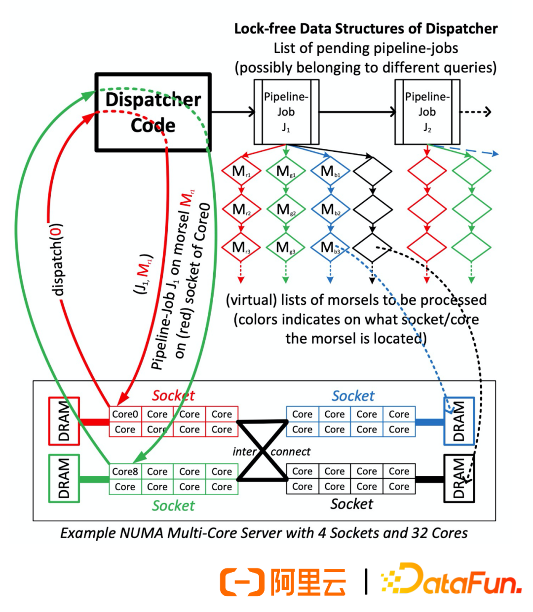 NUMA:多核CPU高效利用,更快速读取内存并行执行调度方案——系统使用固定数量的线程池,各个查询的执行过程中的数据,切分为细粒度的单元(morsel),然后结合对其进行处理的operator pipeline,封装为task,交给线程池去执行。
