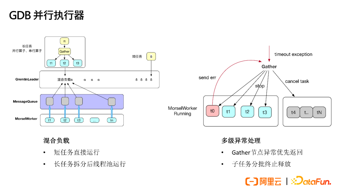混合负载,包含短任务直接运行,以及长任务拆分后线程池运行。在执行过程中,采用多级异常处理,Gather节点异常优先返回,子任务异常,先返回父任务,再分批终止释放。