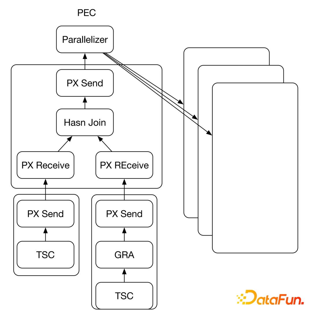 基于Oracle7,进行并行优化。有多个Oracle数据执行节点,每个节点有全量数据,存储share-disk。采用PSC机制、各执行点共享计划树,PX把负载打散到各个节点。不同的执行算子执行在不同的节点上面。单机串行和多机并行执行可以合并起来。执行完,通过汇聚算子统一返回。
