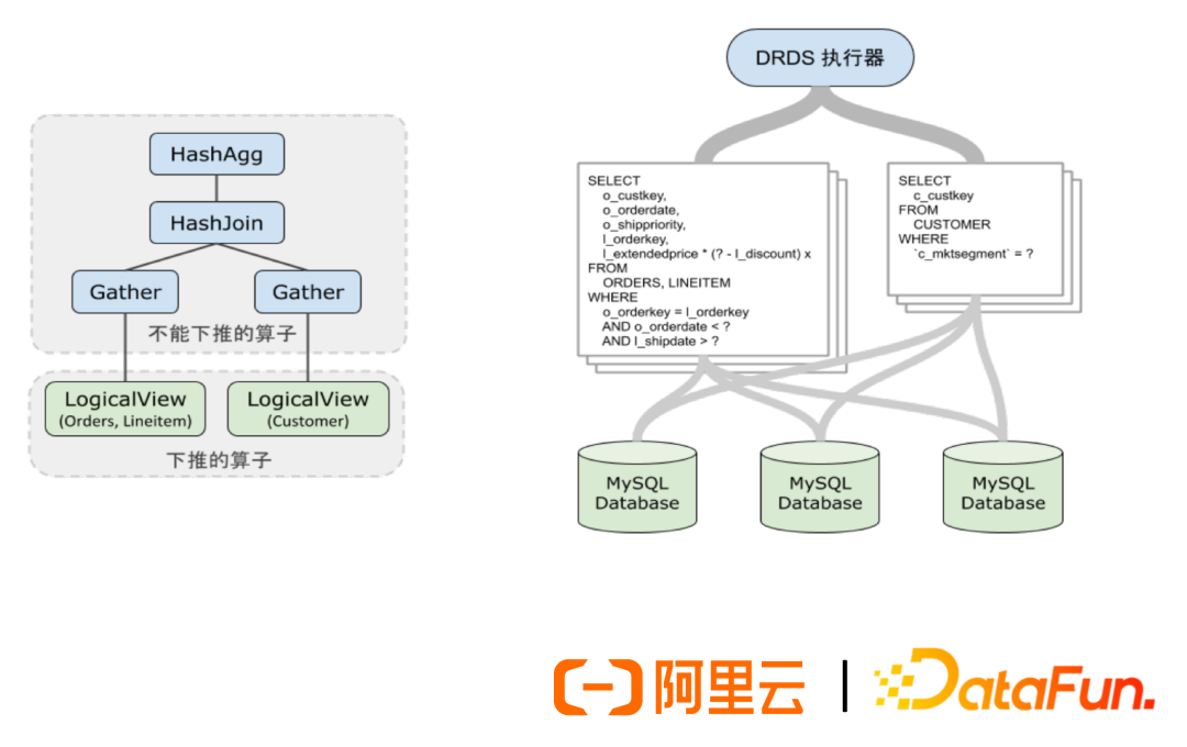 阿里的PolarDB-X 基于火山模型,存储层有多个MySQL节点,上面的汇聚算子可以将执行计划树并行发送给MySQL数据库。