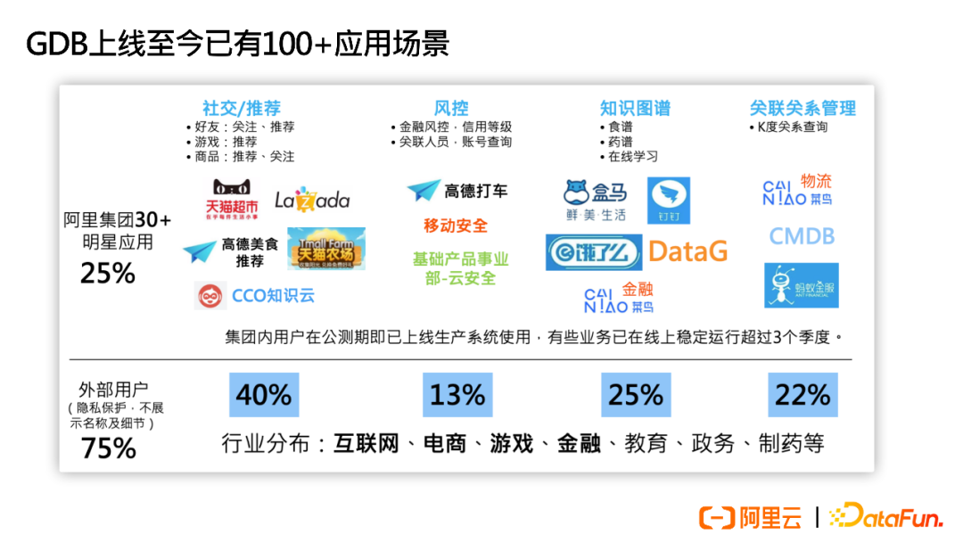 GDB上线至今已有100+应用场景,在阿里集团内部有30+以上的明星应用,包括社交/推荐、风控、知识图谱、关联关系管理;在外部用户中,涵盖互联网、电商、游戏、金融、教育、政务、制药等行业。
