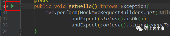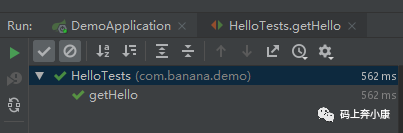 package com.banana.demo;import com.banana.demo.controller.HelloWorldController;import org.junit.Before;import org.junit.Test;import org.junit.runner.RunWith;import org.springframework.boot.test.context.SpringBootTest;import org.springframework.http.MediaType;import org.springframework.test.context.junit4.SpringRunner;import org.springframework.test.web.servlet.MockMvc;import org.springframework.test.web.servlet.request.MockMvcRequestBuilders;import org.springframework.test.web.servlet.setup.MockMvcBuilders;import static org.hamcrest.Matchers.equalTo;import static org.springframework.test.web.servlet.result.MockMvcResultMatchers.content;import static org.springframework.test.web.servlet.result.MockMvcResultMatchers.status;@RunWith(SpringRunner.class)@SpringBootTestpublic class HelloTests {private MockMvc mvc;@Beforepublic void setUp() throws Exception{mvc = MockMvcBuilders.standaloneSetup(new HelloWorldController()).build();}@Testpublic void getHello() throws Exception{mvc.perform(MockMvcRequestBuilders.get("/hello").accept(MediaType.APPLICATION_JSON)).andExpect(status().isOk()).andExpect(content().string(equalTo("Hello World")));}}