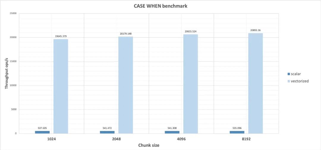 向量化引擎为PolarDB-X的表达式计算带来了显著的性能提升。在下图中,横轴为向量大小,纵轴为吞吐量,不同标量表达式和向量化表达式的性能测试对比结果如下: