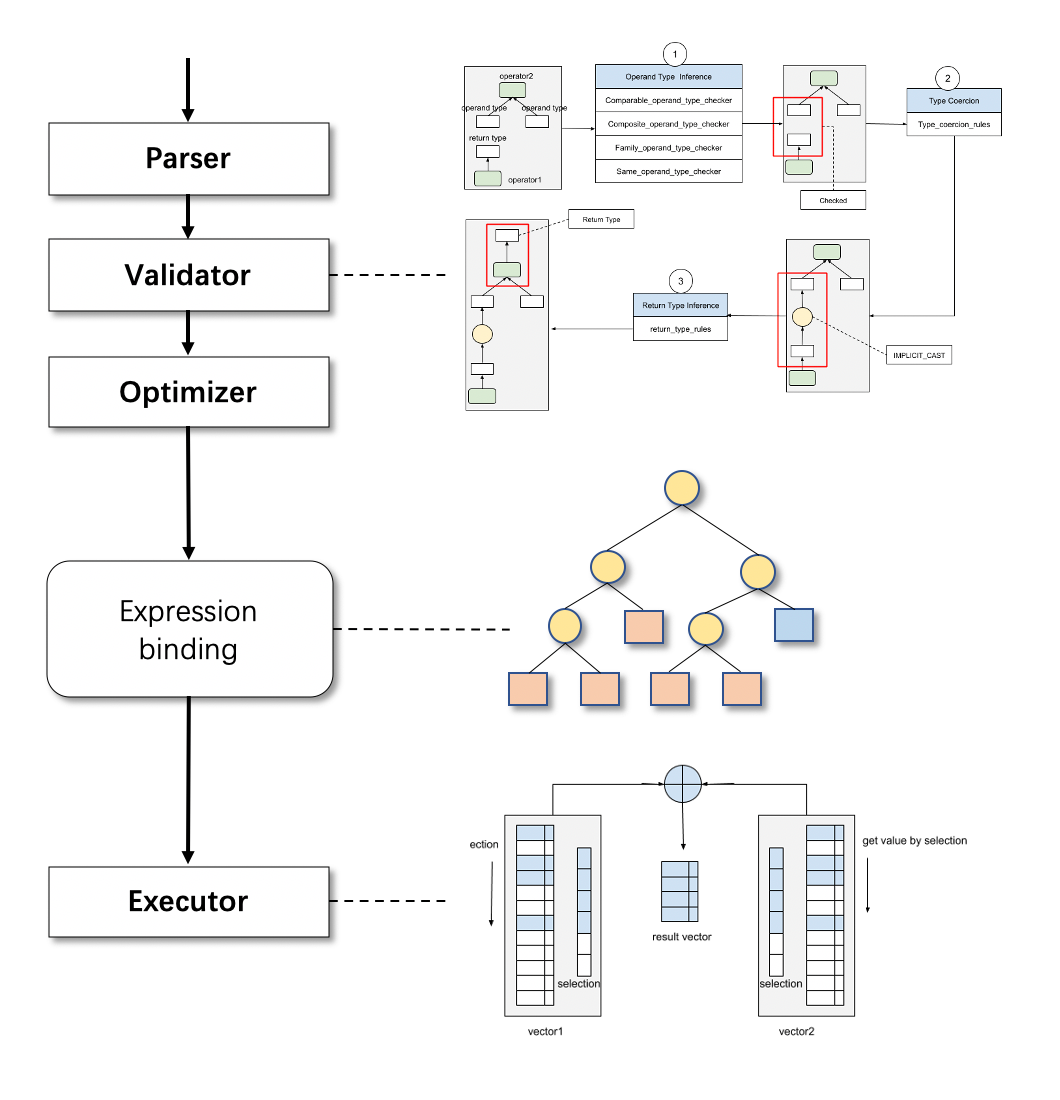 用户SQL经解析后,在validator中进行校验,推导和修正表达式的类型信息;这一阶段为向量化运算提供正确的、静态的类型信息;