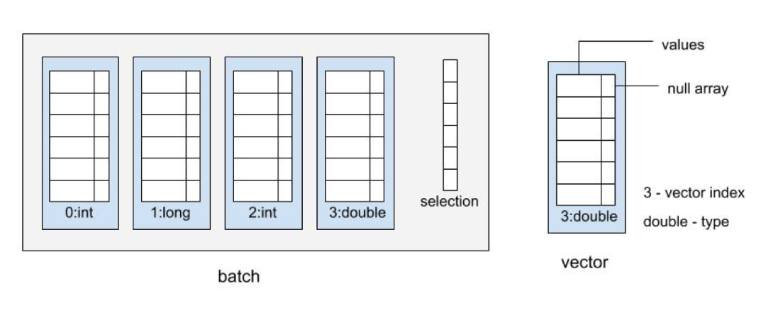 向量化表达式执行时,所有的数据都会存放在batch这一数据结构中。batch由许多向量(vector)和一个selection数组而组成。其中,向量vector包括一个存储特定类型的数值列表(values)和一个标识null值位置的null数组组成,它们在内存中都是连续存储的。null数组中的bit位以0和1来区分数值列表中的某个位置是否为空值。