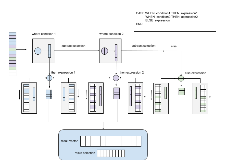 引入向量化执行器以后,我们可以设计短路求值来优化此问题,每一个子表达式需要被提供合适的selection数组,从而正确选择列中合适的位置来进行向量运算。设第i个when条件表达式接受的selection元素集合为