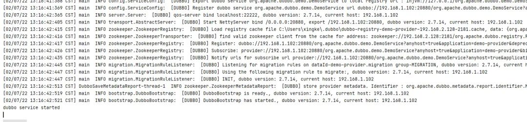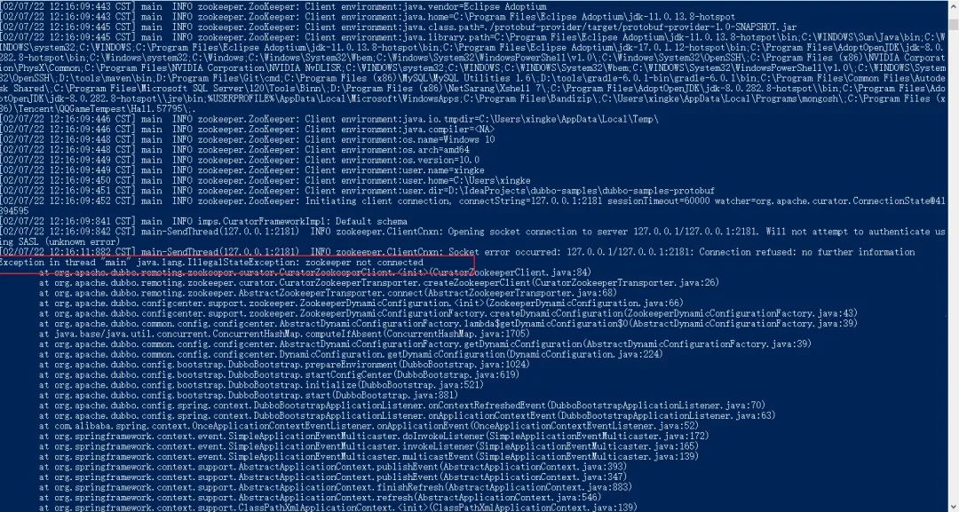 还好我们已经装过了Zookeeper,我们将地址改掉就行。注意哈,高版本的JDK改动了很多东西,Dubbo 官方提供的示例,在JDK 17下可能跑不起来,如果到时候编译报错,将环境调整到JDK8就行,我自己测试的话,JDK 11也可以的,但是有的时候会报Zookeeper连接不上的错误。我用IDEA启动一下: