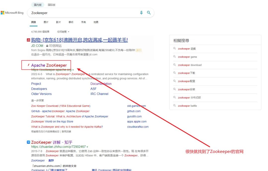 首先我们打开bing搜索引擎,搜索Zookeeper,有同学可能会问,你为什么让打开bing搜素引擎,而不是百度呢。那是因为目前在百度搜索Zookeeper,第一页没找到官网: