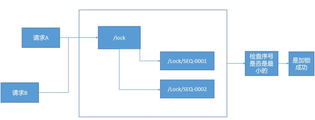 请求A首先来到Zookeeper请求创建临时顺序节点,Zookeeper为请求A生成节点,请求A检查lock目录下自己的序号是否最小,如果是代表加锁成功,B监听节点顺序值小于自己的节点的变化,如果A执行则B去获取锁,如果有C、D等更多的客户端监听,道理是一样的。