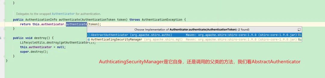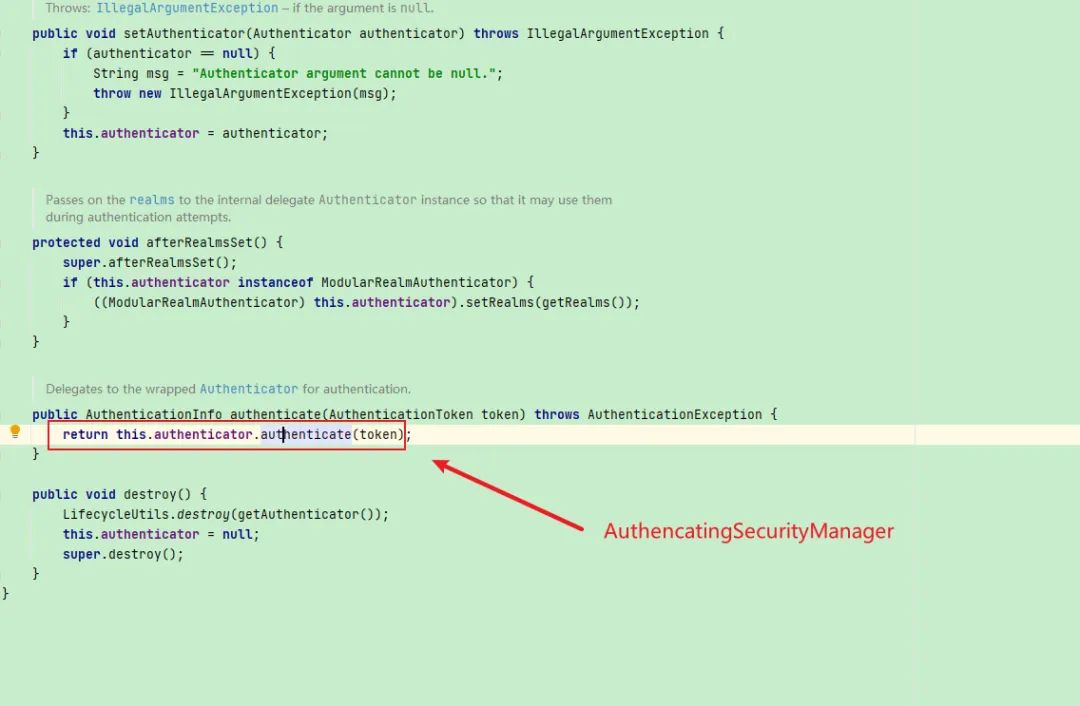 我们上面用的是DefaultSecurityManager, 所以我们需要进入该类的方法来看是怎么执行登录的, DefaultSecurityManager.login调用authenticate(token)来获取用户信息,authenticate()方法来自DefaultSecurityManager的父类AuthenticatingSecurityManager, 该类拥有一个Authenticator成员变量,由该成员变量调用authenticate,获取用户信息