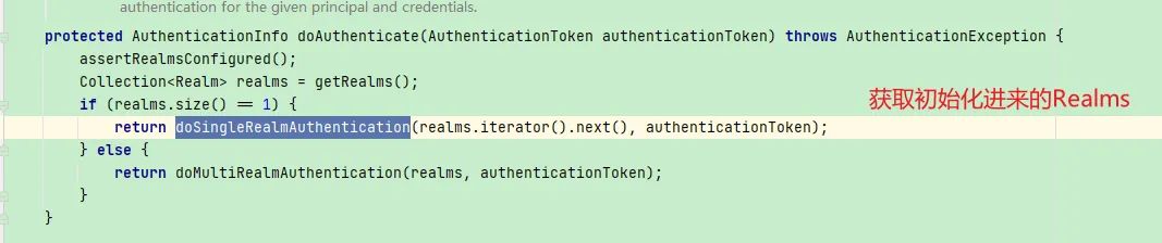 Realm这个接口太顶层了,我们要做自己的Realm的话还是找一个抽象类,我们上面的SimpleAccountRealm就是继承自AuthorizingRealm,重写了doGetAuthenticationInfo用于登录验证,doGetAuthorizationInfo用于做权限验证。我们自己写的如下: