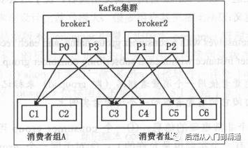 图上清晰展示了两个consumer group订阅相同的topic场景,图中topic有p0,p1,p2和p3这4个分区,分别保存在broker1和broker2上,具体分配如下,