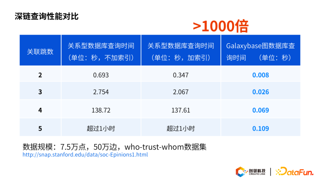上表中用who-trust-whom公开数据集,对比了多关联跳数在关系数据库的查询时间(不加索引、加索引)和图数据库的查询时间。