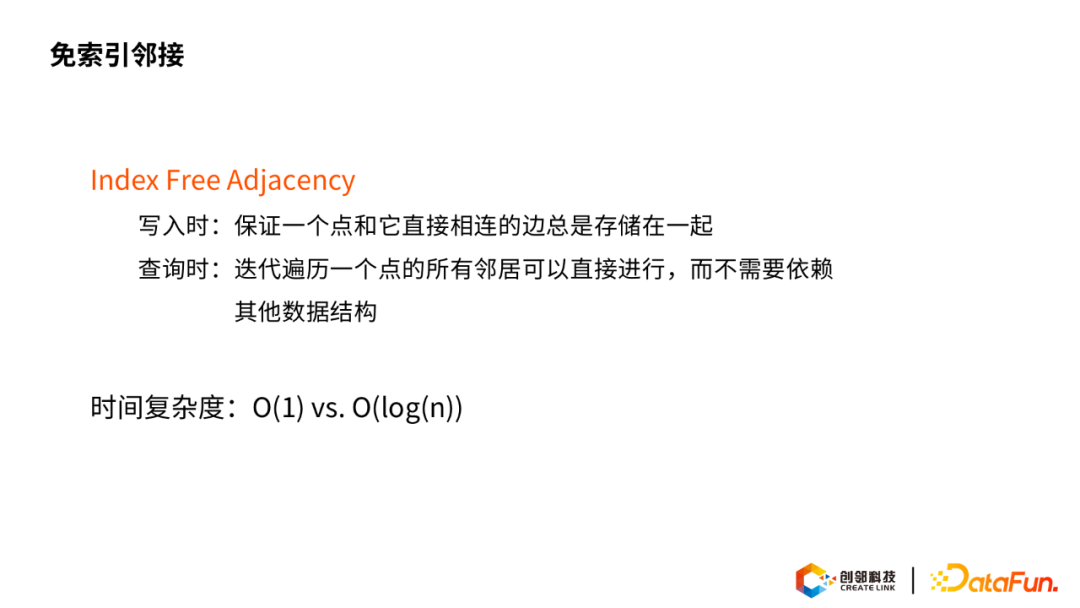 在写入时,免索引邻接可以保证一个点和与它直接相邻的边总是存储在一起。因此查询时迭代遍历一个点的所有邻居就可以直接进行,而不需要依赖其他索引类的数据结构。和依赖于一个全局索引相比,免索引邻接会让邻居遍历操作每一次迭代的时间复杂度降为O(1),也就是说不需要任何其他操作就能直接进行迭代。因此迭代一个点的所有邻居的时间,就是这个点的邻居数量乘以O(1),仅与这个点自己的邻居数量有关,而与整个图中全体的点边数量是无关的。如果使用全局索引,那么每次定位都需要一个O(log(n))的时间复杂度。这里的n是参与全局索引的数据规模,可以理解为整体的边数量。因此迭代一个点的所有邻接的时间,就是这个点的邻居数量乘以O(log(n))。