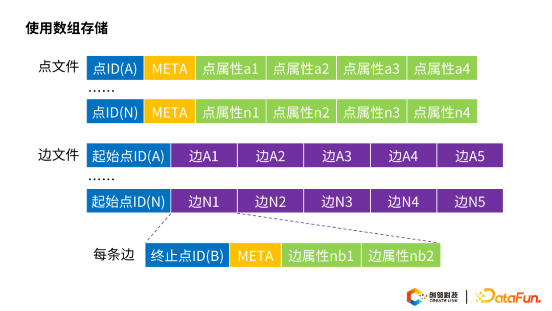首先最直接的方法就是用一个数组,把每一个点上面的所有边,按照顺序一起存储。点文件就是一系列的点组成,每个点的存储,包括点的ID、META信息,以及这个点的一系列属性。每个边文件中,按照起始点的顺序存储点上对应的边。每条边的存储包括终止点ID、META信息,以及边的属性。META信息包括点边类型、边方向、实现事务的额外字段等。在这个存储里,可以直接从起始点遍历所有的边数据,它的读取性能非常高。