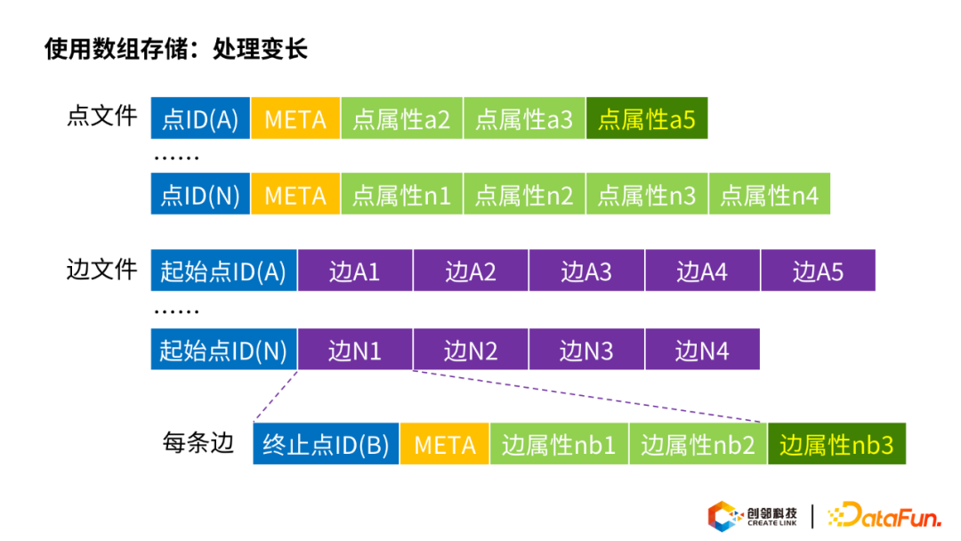 但是这样的存储方式也需要处理一个很棘手的问题,就是变长数组的问题。变长可能由很多因素导致,比如两个点的属性数量可能不一样,属性本身内容有可能不一样,属性值如果是字符串的话,字符串也是变长的,由于属性长度不一样导致每个点的存储空间也是变长的。所以点文件和边文件中都会面临变长数组的问题。