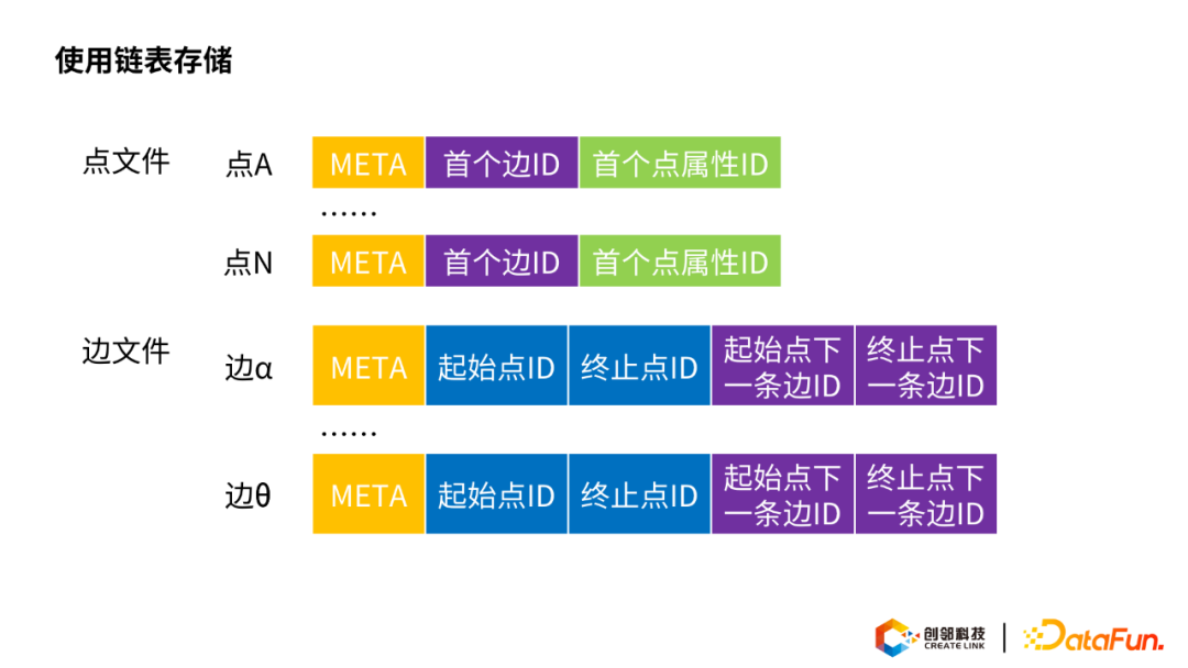 为了彻底解决数组存储的变长问题,可以改用链表方式来存储。在链表的存储方式中,点文件和边文件里面存储的全部都是ID,每个ID都是固定长度的,通过ID可以计算偏移量位置,通过偏移量位置直接读取数据。因为它能够通过位置计算ID,偏移量和ID是一一对应的,所以每个点也不用保存自身的ID。