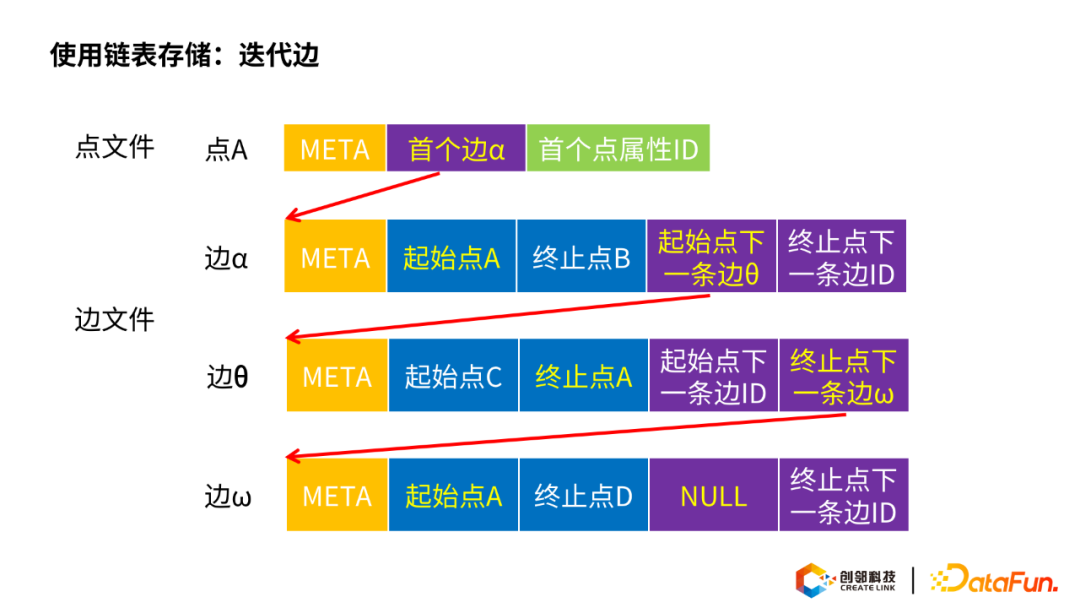 首先从点A出发,在点文件中找到首个边ID:α,去边文件中找到α对应的偏移量,就能把整条边数据读出来。边数据里,有起始点和终止点,比如这条边的起始点A、终止点B。下一条边的偏移量是θ,那么就再找到θ的位置。θ边读出来,它是从起始点C到终止点A。这时候点A是处于终止点的位置上,我们找对应终止点的下一条边,是ω。然后再找ω的偏移量,读出来,是一个A到D的边,A在起始点的位置上,下一条边是NULL,迭代遍历结束。我们可以看到,链表存储的方式很好地解决了变长的问题。