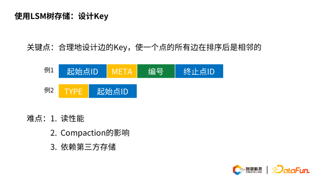 上图中例1,只要把边Key的最高位放起始点ID,那么排序之后,从这个起点出发的边自然就会排在一起。这里还可以有一个编号字段,加入编号字段就可以支持在两点之间的同类型多条边的共存。因为LSM树是KV结构,所以如果只有起始点、终止点和META的话,那么两点之间同类型的边只有一个Key,所以只能存一条。对于像转账交易、访问记录这样具有事件性质的边来说,两点之间肯定会有多条同类型的边,在这样的场景下,这个能力就是非常重要的。