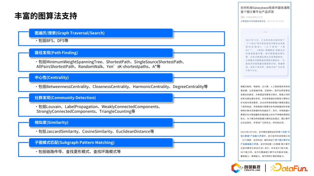 Galaxybase也提供了丰富的算法支持,提供了包括像图遍历、路径发现、中心性分析、社群发现、相似度分析、子图模式匹配等几个大类的上百种图算法。不久前率先通过了信通院图计算平台的一个产品基础能力评测,涉及五个能力域,34个能力项的评测,全方位覆盖了图平台的基本能力、兼容能力、管理能力、高可用和扩展能力。