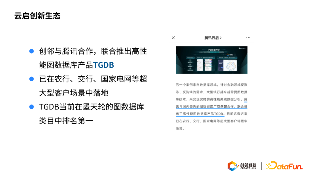 同时,我们也加入了腾讯云启创新生态。我们创邻和腾讯合作联合推出了高性能的图数据库产品TGDB,已经在农行、交行、国家电网等超大型客户场景中落地。TGDB当前在墨天轮的图数据库类目中排名第一。