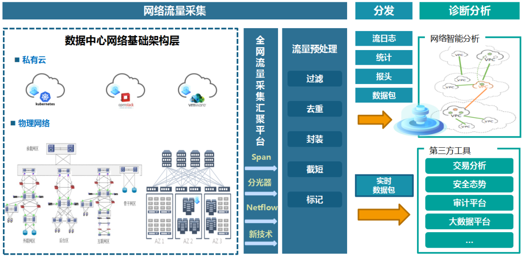 网络借助其承载着所有业务流量的先天优势,通过建立统一的流量采集分发平台对网络中业务流量进行全面采集并输出至BPC交易分析平台、NPM网络监控平台、安全态势分析平台、大数据平台、审计平台等各大运维平台,成为运维智能化、数据分析的基础。