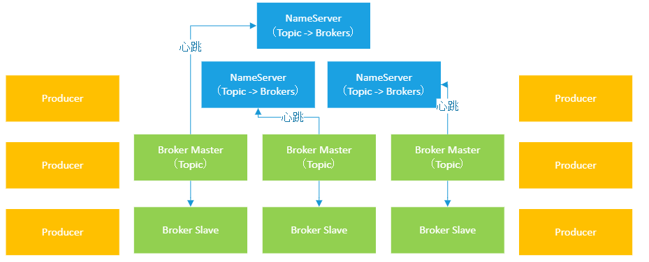 NameServer一般是集群化部署,各个机器上部署的NameServer会互相同步收到的元数据,保证各个NameServer上包含的集群元数据都是相同的。这样的架构可以保证即使任何一个NameServer宕机了也不要紧。