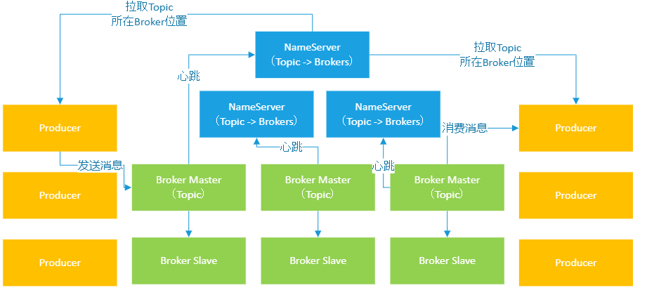 Producer在生产消息到Topic的时候,先得找NameServer问一下Topic存放在哪些Broker上,然后就可以跟那些Broker建立连接发送消息过去了。
