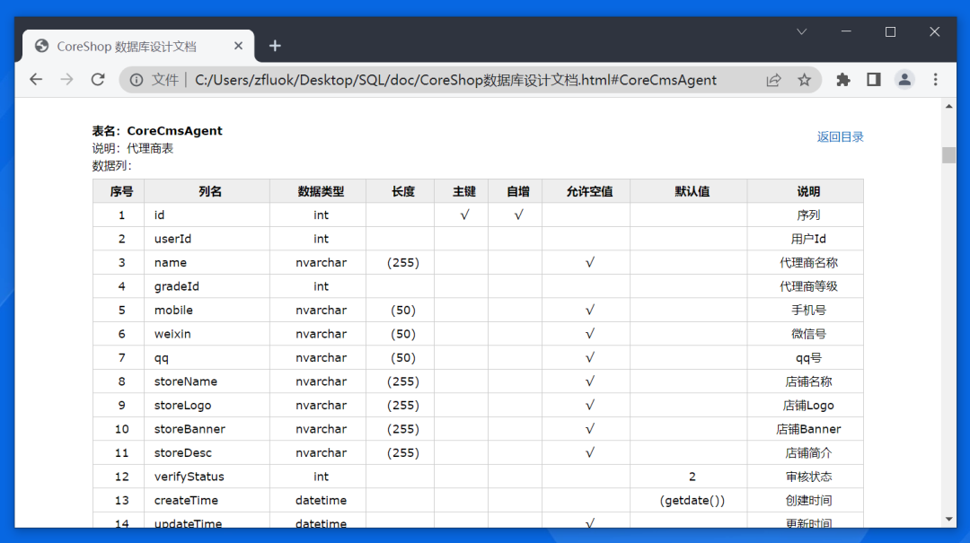 序号 | 列名 | 主键 | 自增 | 数据类型 | 长度 | 允许NULL值 | 默认值 | 备注说明视图