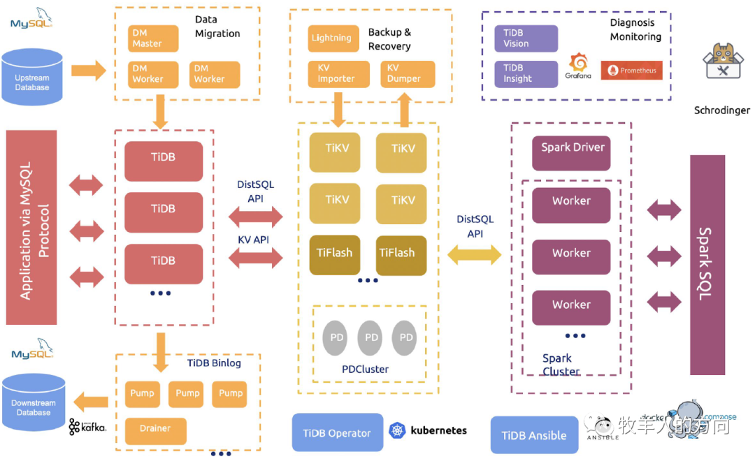计算层TiDB Server,负责与客户端通信,执行SQL解析和优化 存储层TiKV和TiFlash,支持key-value键值对存储和列式存储 调度层PDCluster,整个集群的大脑,负责分发调度指令给TiKV 分析计算模块TiSPARK,与Spark集群进行联动 云原生架构,基于K8S实现容器云平台的自动化部署和运维 通过TiDB Binlog实现MySQL数据库的实时同步