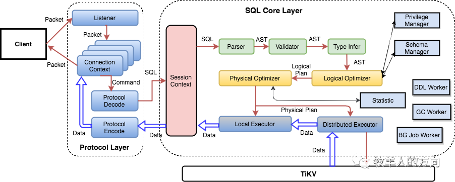 TiDB Server会解析MySQL Protocol Packet,获取请求内容,对SQL进行语法解析和语义分析,制定和优化查询计划,执行查询计划并获取和处理数据