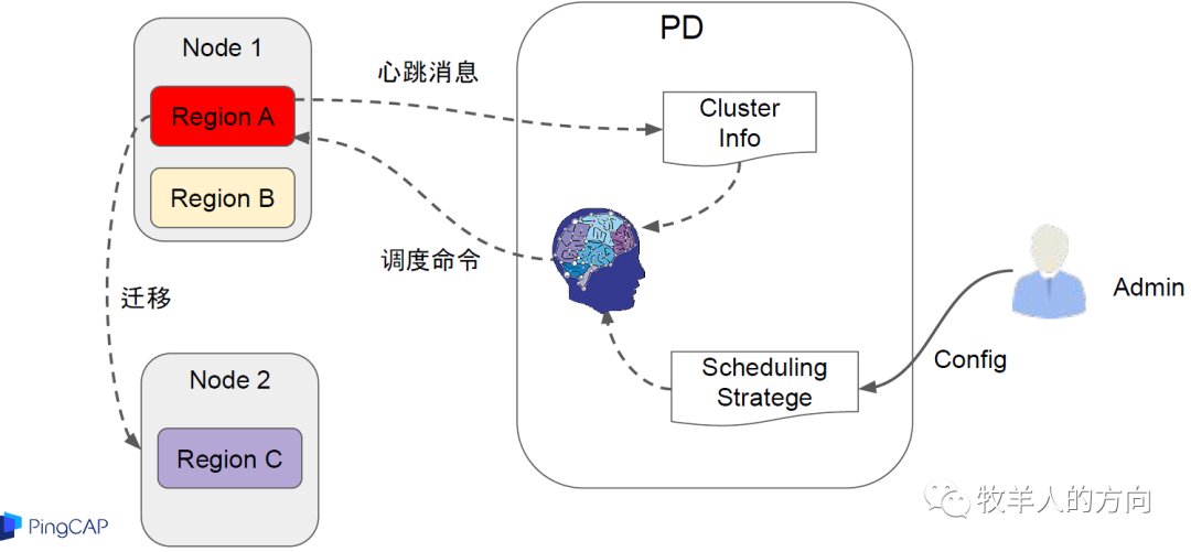 每个Raft group leader会定期向PD汇报Region状态信息,包括Leader的位置、Followers的位置、掉线Replica的数量、数据写入/读取速度等
