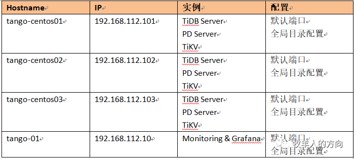 TiDB集群最小部署环境需要3个节点,这里将TiDB Server、PD Server和TiKV放在一台虚机上共3台主机,另外一个主机部署控制台和监控节点。