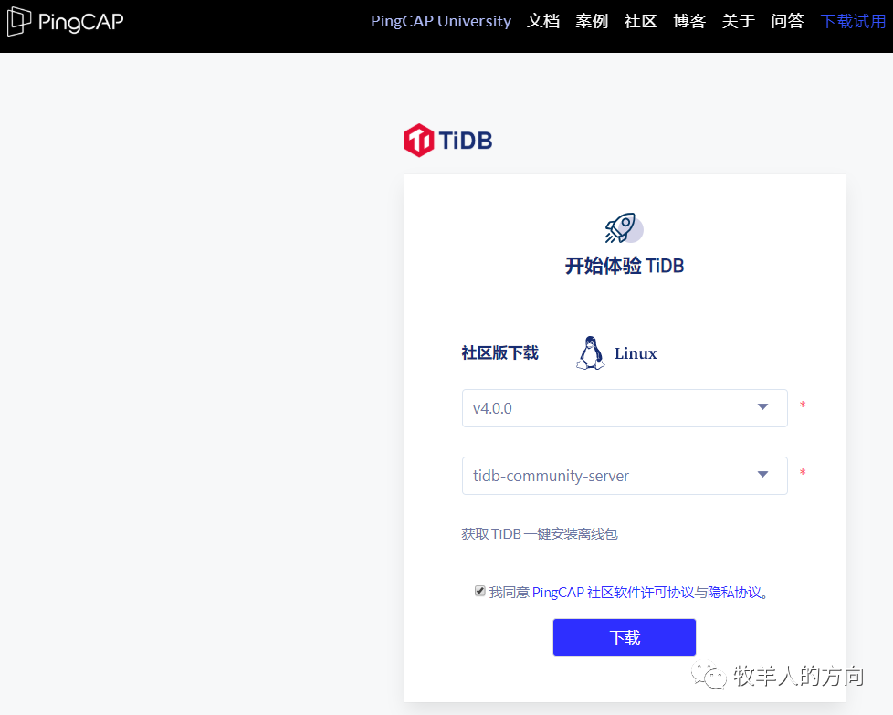 下载地址为https://pingcap.com/download-cn/community/,选择4.0版本