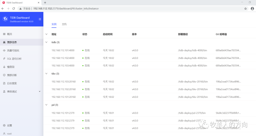 通过http://192.168.112.102:2379/dashboard登录TiDB Dashboard,登录用户和口令为TiDB 数据库 root 用户和口令,默认密码为空。主页面显示 TiDB 集群中节点信息:
